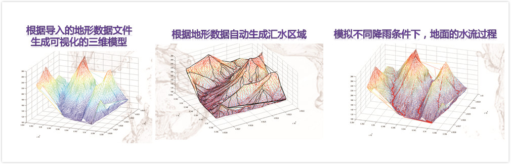 本系統(tǒng)應(yīng)用三維地理信息技術(shù),建立匯水區(qū)域自動生產(chǎn)模型,充分考慮地面滲透、土地利用、地面粗糙程度等因素對地面水流流動的影響,在數(shù)字化排水管網(wǎng)以及排水設(shè)施資料的基礎(chǔ)上,應(yīng)用水動力學(xué)原理以及雨量排出平衡原理,結(jié)合氣象預(yù)報數(shù)據(jù),模擬不同降雨條件下城市地面以及排水管道徳水量和水位變化,達(dá)到給水預(yù)測的目的,對積水深度超過預(yù)警線的情況提供報警。